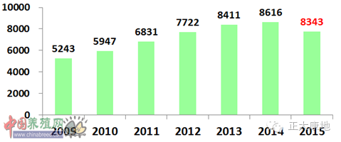 根据中国饲料工业协会公布的数据,2015年中国饲料总产量20009万吨,同比增长1.4%。其中猪料产量8 343.6万吨,同比下降3.2%,这是我印象中第一次出现猪料增速“跑输”饲料总量增速。