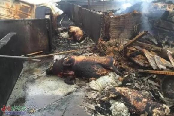 黎女士的养猪场大概 600 多平方米,已经全部被烧毁,每个猪栏里都躺着数头被烧死的猪,有些猪的内脏露在外面,已经有些发臭,有些猪的尸体横卧在养猪场外面的地沟里,浑身被烧烂。