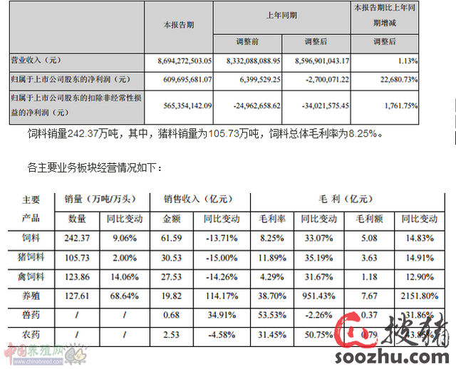 8月14日晚,正邦科技公布2016年半年度报告,上半年正邦科技营业收入86.94亿元,同比增1.13%;归属于上市公司股东的净利润6.10亿元,同比增22681%。