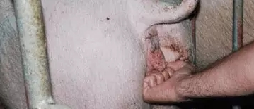 第三步:利用拳头按压母猪阴户下面,或者用膝盖按压;